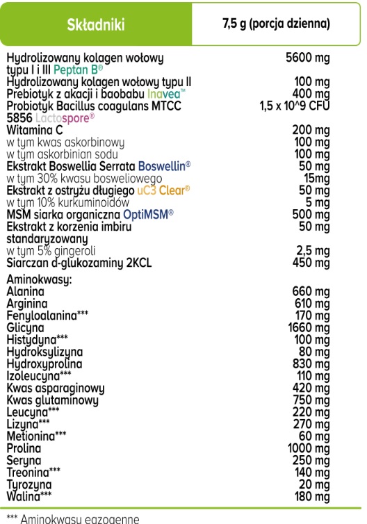 - Składniki: Hydrolizowany kolagen typu I i III Peptan BⓇ, hydrolizowany kolagen typu II z chrząstek wołowych, prebiotyk z akacji i baobabu Inavea™, probiotyk LactosporeⓇ Bacillus coagulans MTCC 5856, kwas askorbinowy, askorbinian sodu, ekstrakt boswellia serrata standaryzowany na 30% kwasu bosweliowego [DER 10:1], ekstrakt ostryżu długiego (Curcuma longa) standaryzowany na 10% kurkuminoidów [DER 66:1], siarka organiczna, ekstrakt z korzenia imbiru standaryzowany na 5% gingeroli [DER 30:1], siarczan d-glukozaminy 2KCL ze skorupiaków, aminokwasy: alanina, arginina, fenyloalanina, glicyna, histydyna, hydroksylizyna, hydroxyprolina, izoleucyna, kwas asparaginowy, kwas glutaminowy, leucyna, lizyna, metionina, prolina, seryna, treonina, tyrozyna.