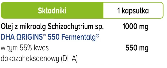 Olej z mikroalg Schizochytrium sp DHA Origins 550 Fermentalg®, substancja utrzymująca wilgoć: glicerol; materiał kapsułki: skrobia modyfikowana, woda oczyszczona; przeciwutleniacz: ekstrakt z rozmarynu.