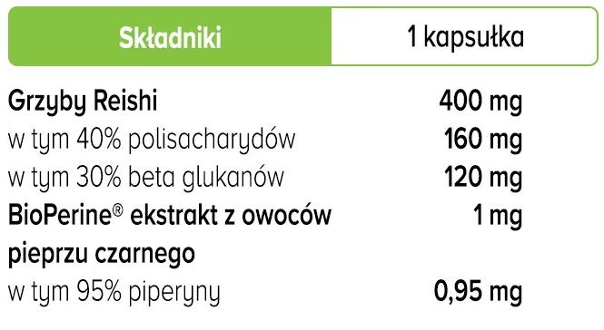 Grzyby Reishi – Lakownica żółtawa (Ganoderma lucidum (Curtis) P. Karst.) ekstrakt z owocników standaryzowany na 40% polisacharydów i 30% beta-glukanów [DER 25:1], BioPerine® ekstrakt z owoców pieprzu czarnego standaryzowany na 95% piperyny, otoczka kapsułki: hydroksypropylometyloceluloza.