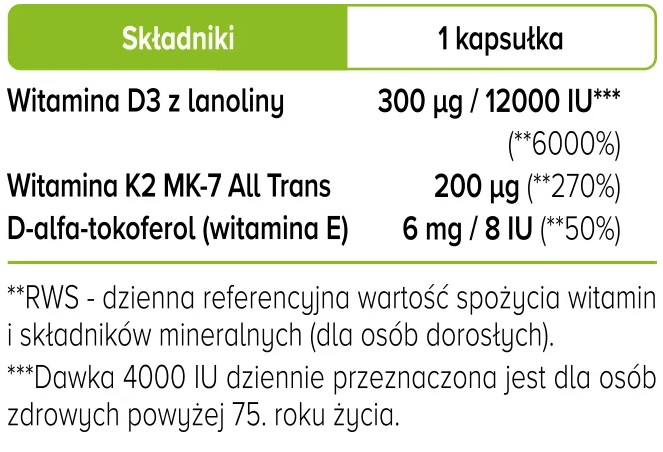 Olej MCT, witamina D3 z lanoliny (cholekalcyferol), witamina K2 (menachinon-7), D-alfa-tokoferol (witamina E), otoczka kapsułki: żelatyna wołowa, glicerol.