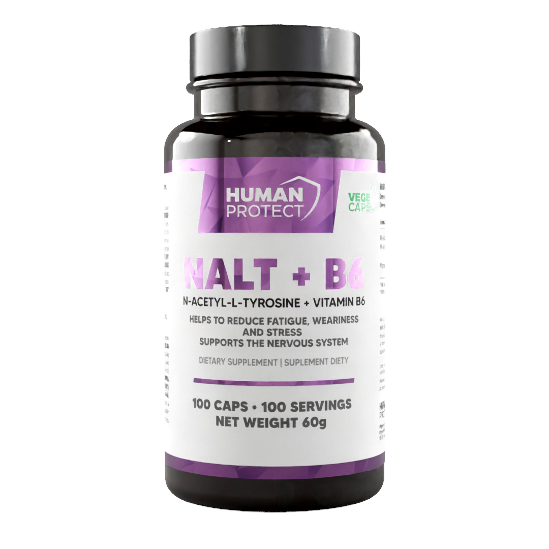 Human Protect NALT + B6 to suplement diety w kapsułkach, zawierający N-acetylo-L-tyrozynę (NALT) oraz witaminę B6. Składniki te wspierają funkcje poznawcze, nastrój i jakość snu, a także pomagają w prawidłowym metabolizmie białek.